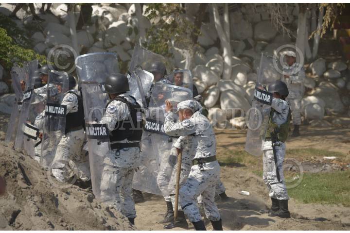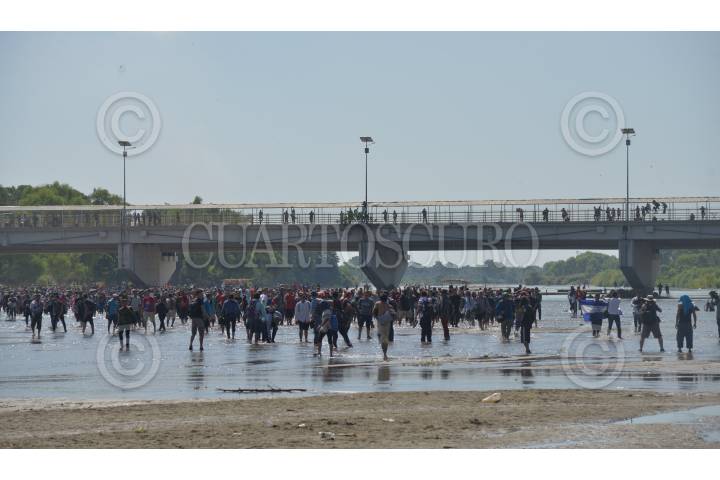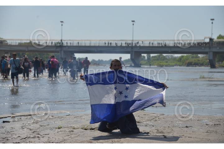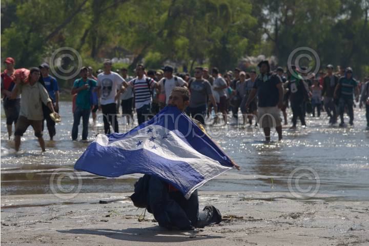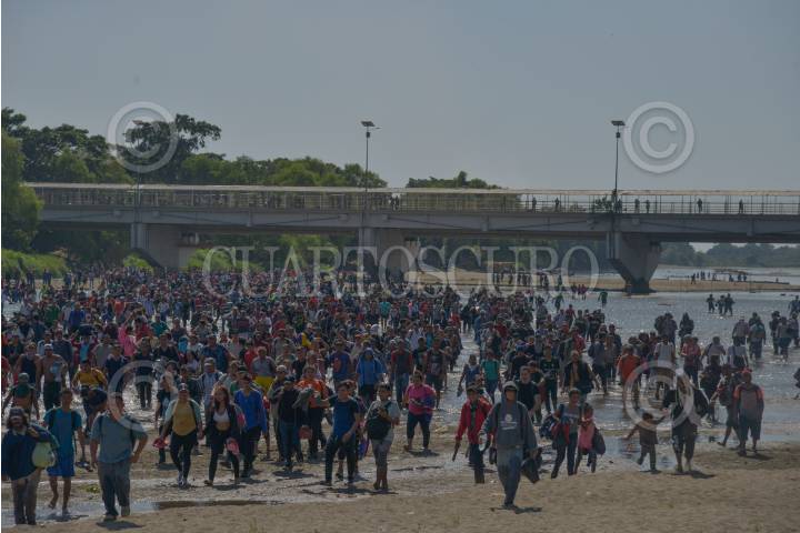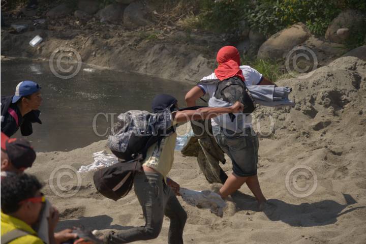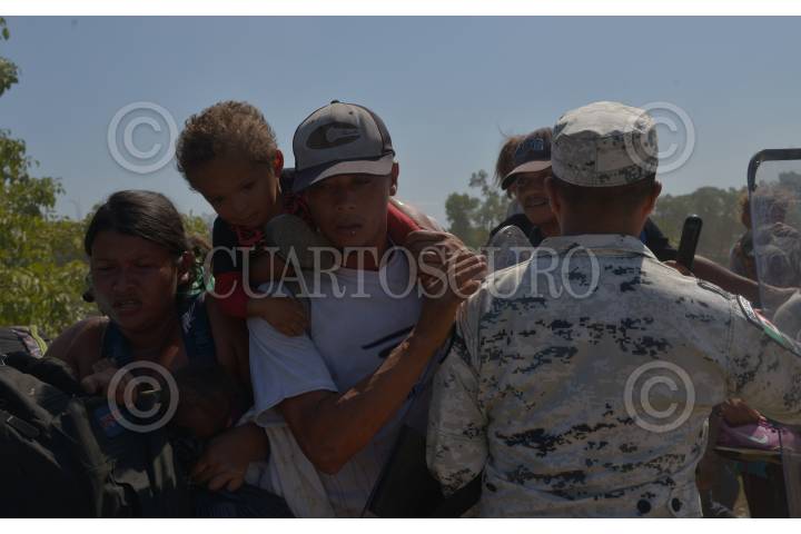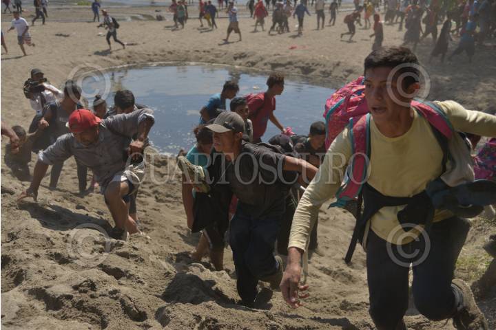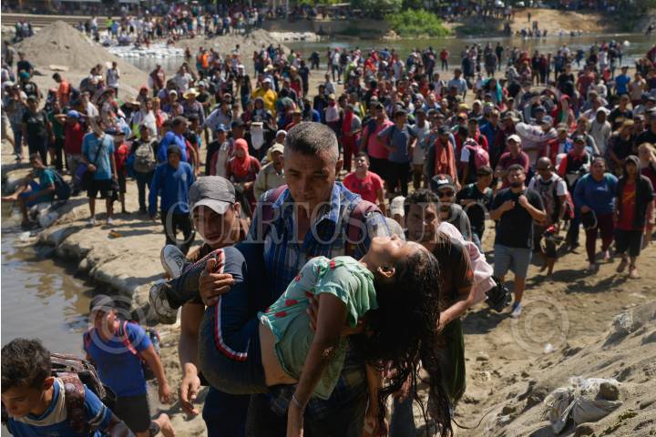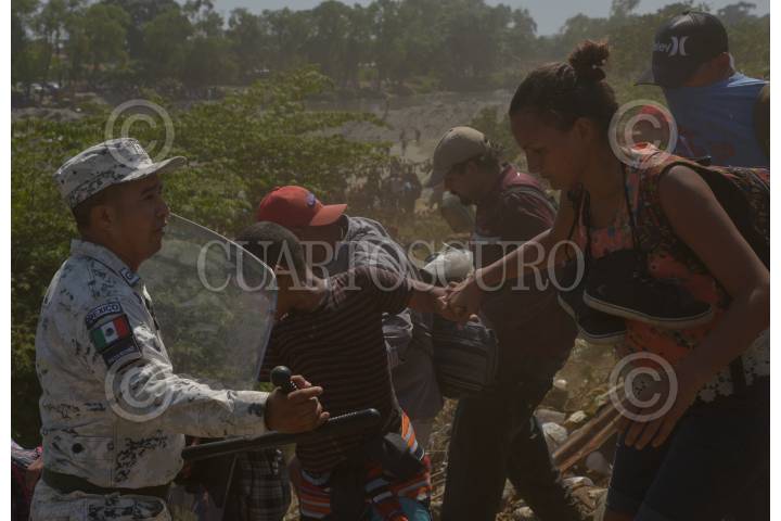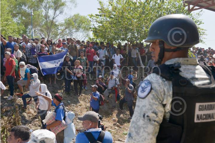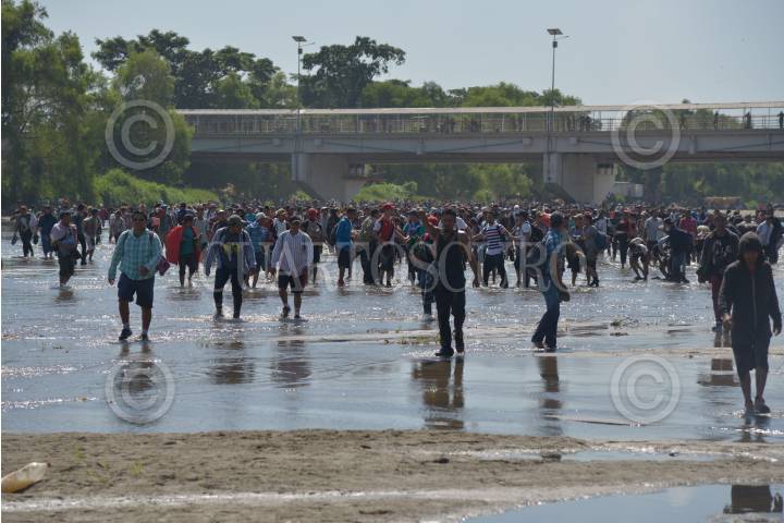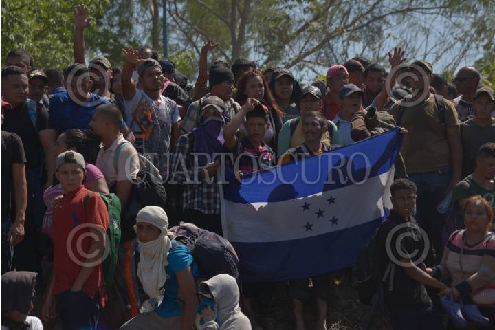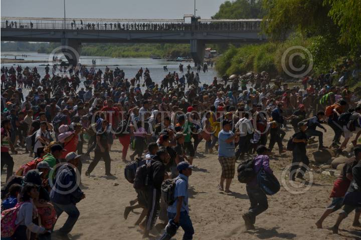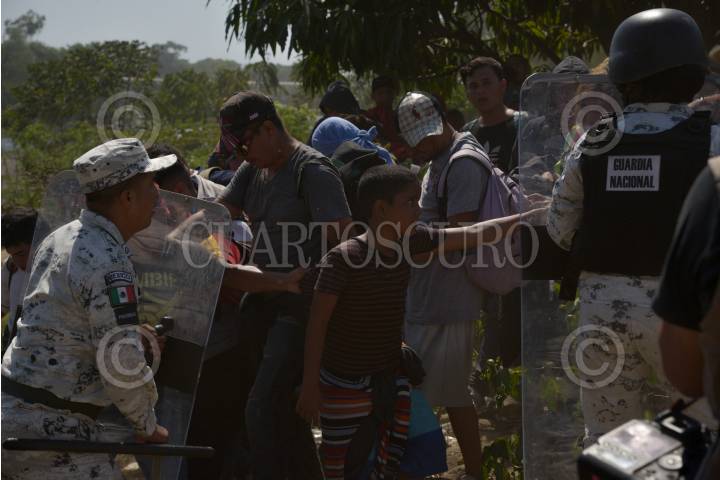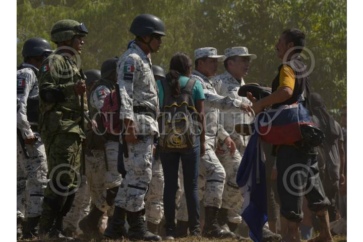Cientos de migrantes centroamericanos decidieron cruzar masivamente la frontera entre Guatemala y México, por el Río Suchiate, la Guardia Nacional los contuvo en el bordo del acuífero