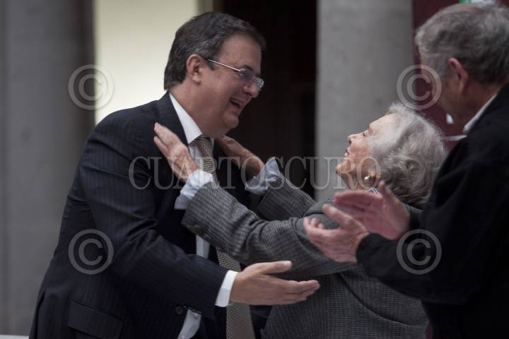 MÉXICO, D.F., 02OCTUBRE2012.- Marcelo Ebrard Casaubón, Jefe de Gobierno, abraza a la escritora Elena Poniatowska, al finalizar una ceremonia conmemorativa de la matanza de la Plaza de las Tres Culturas el 02 de octubre de 1968. FOTO: MOISÉS PABLO /CUARTOSCURO.COM