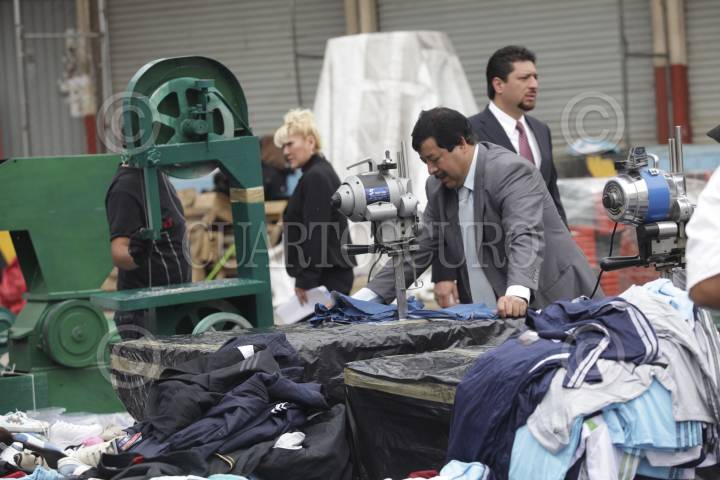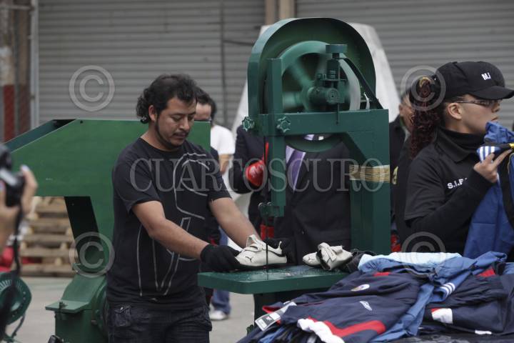 CIUDAD DE MÉXICO, 19ABRIL2017.- Este miércoles se llevó a cabo la destrucción de 160 toneladas de ropa de paca, dos mil 99 botellas de alcohol, 660 mil 920 discos grabados y 12 vehículos, como parte de las acciones que implementa el Gobierno de la Ciudad de México, a través de la Unidad de Inteligencia Financiera (UIF), en contra del comercio ilegal de procedencia extranjera. Al supervisar la destrucción de dicha mercancía, el Jefe de Gobierno, Miguel Ángel Mancera Espinosa, destacó que también se dio cumplimiento al compromiso que se asumió en la Conferencia Nacional de Gobernadores (CONAGO) respecto a la destrucción de más de mil máquinas tragamonedas. FOTO: INFORMACIÓN CDMX /CUARTOSCURO.COM