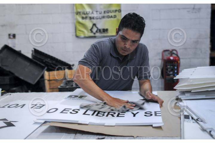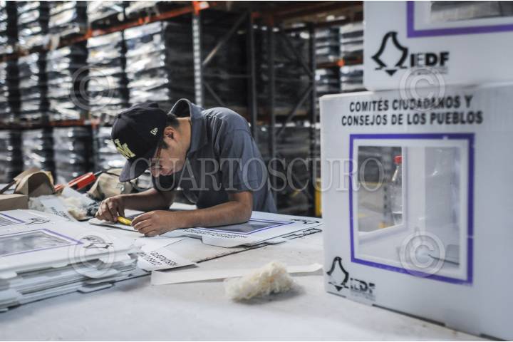 CIUDAD DE MÉXICO, 26JULIO2016.- Personal del Instituto Electoral del Distrito Federal, recicla y acondiciona materiales electivos para la consulta ciudadana de presupuesto participativo, y los comités ciudadanos y consejos de los pueblos del próximo 4 de septiembre. Estos materiales se esperan reciclar para elecciones posteriores en la Ciudad de México, a fin de generar la menor basura posible. El consejero del IEDF, Yuri Gabriel Beltrán Miranda, ofreció un recorrido por las bodegas del instituto en la delegación Tláhuac. FOTO: DIEGO SIMÓN SÁNCHEZ /CUARTOSCURO.COM