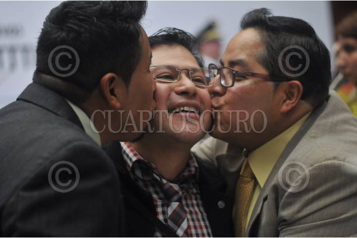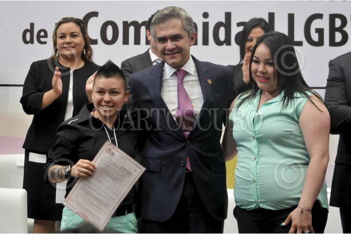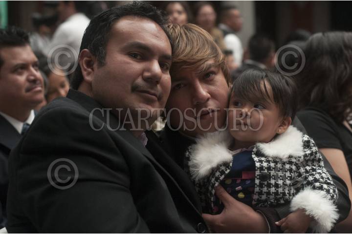 MÉXICO, D.F., 21MARZO2014.- Como parte de la segunda jornada de bodas colectivas de la comunidad Lésbico, Gay, Bisexual, Transexual, Travesti, Transgénero e Intersexual (LGBTTTI), 58 parejas homosexuales contrajeron matrimonio en el Museo de la Ciudad de México, evento organizado por el gobierno capitalino, al que asistió Miguel Ángel Mancera, jefe de gobierno. El 21 de diciembre de 2009 la Asamblea Legislativa (ALDF) aprobó una enmienda al artículo 146 del código civil donde reconoce jurídicamente el matrimonio entre personas del mismo sexo en el Distrito Federal. FOTO: DIEGO SIMÓN SÁNCHEZ /CUARTOSCURO.COM