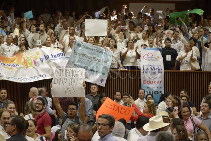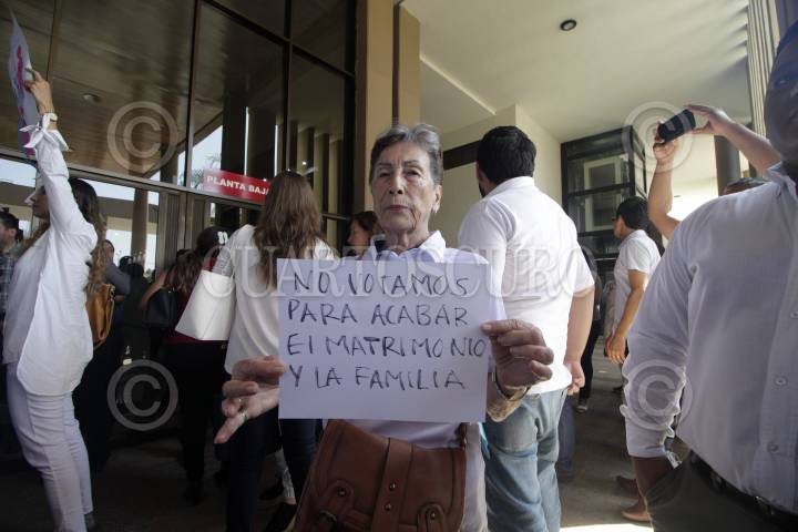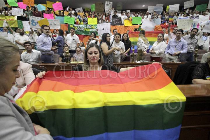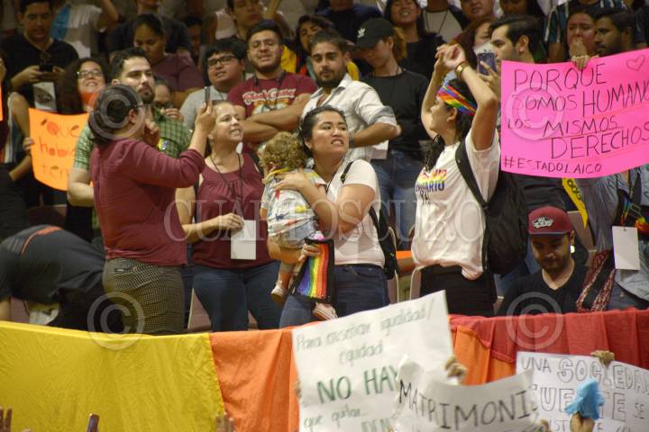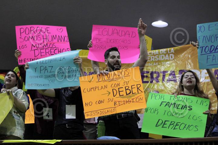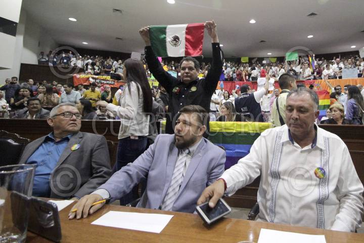 CULIACÁN, SINALOA, 18JUNIO2019.- En medio de gritos de manifestantes en pro y en contra de la iniciativa de Ley de Matrimonio Igualitario en Sinaloa, los diputados de la 63 Legislatura votaron en mayoría en contra del dictamen. El proyecto de ley se había prolongado por más de 5 años, y esta mañana recibió su primera lectura en el Congreso de Sinaloa obteniendo una respuesta negativa, con 20 votos en contra y 18 a favor. La iniciativa presentada por la entonces diputada Merary Villegas de Morena recibió lectura este mañana. En el documento se especifican diversos estatutos que las modificaciones a la constitución requieren para hacer posible la unión legal entre personas del mismo sexo. Luego de la participación de representantes de las diferentes bancadas de partidos en el Congreso, la votación se vio polarizada entre diputados de los diferentes partidos, el dictamen negativo imposibilita a la iniciativa a ser votada en este mismo periodo de sesiones. El lugar se abarrotó de representantes de grupos religiosos y de representantes LGBT+, quienes aseguran que no se van a cansar y que se buscará aprobar la iniciativa en el siguiente periodo. FOTO: JUAN CARLOS CRUZ /CUARTOSCURO.COM