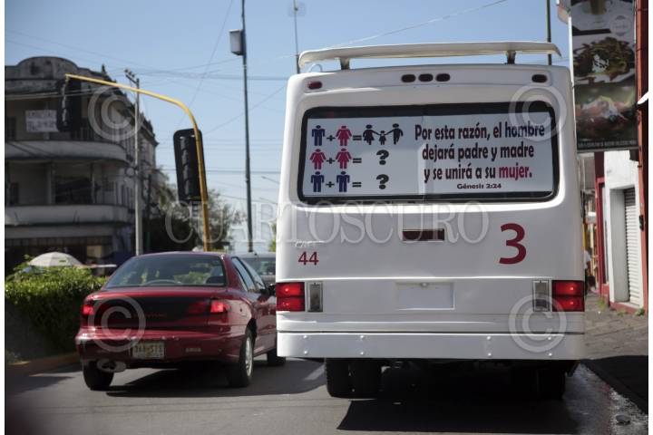 CUERNAVACA, MORELOS, 01AGOSTO2016.- Luego de que el pasado 4 de julio se aprobó el matrimonio entre personas del mismo sexo en Morelos, la iglesia católica y grupos afines han impulsado una campaña para reprobar dicha iniciativa. En la imagen un microbús del servicio público lleva en el medallón trasero publicidad en contra de los matrimonios igualitarios. FOTO: MARGARITO PÉREZ RETANA /CUARTOSCURO.COM