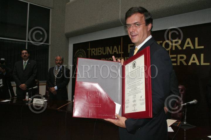 MÈXICO, D.F. 14SEPTIEMBRE2006.- Se hizo entrega de la constancia de mayorìa de votos a Marcelo Ebrard en el Instituto Federal Electoral del Distrito Federal, en la imagen, el pròximo jefe de gobierno de la ciudad muestra el documento oficial que fuè entregado por el magistrado presidente Hermilo Herrejòn Silva. FOTO: PAOLA HIDALGO/CUARTOSCURO.COM