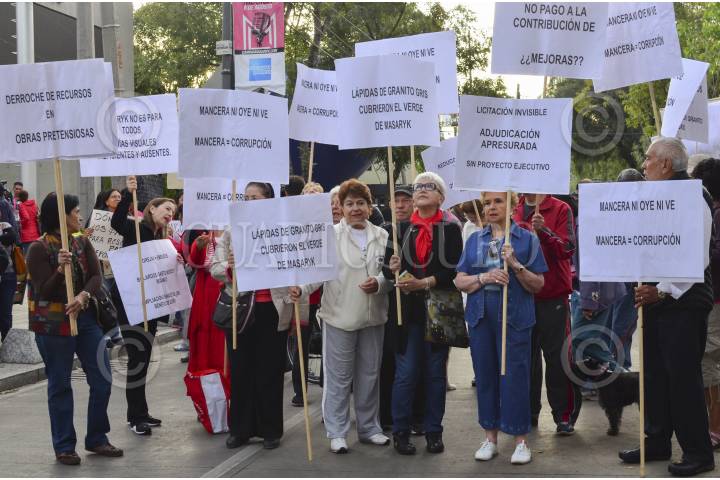 MÉXICO, D.F., 09AGOSTO2015.- Tras dos años de haber sido sometida a un proceso de remodelación, la Avenida Mazaryk, una de las principales arterias viales y peatonales de Polanco, además de una de las zonas comerciales más significativas de la capital, hoy luce, de acuerdo con vecinos que protestaron esta mañana como "un robo". Los supuestos objetivos como cableado subterráneo, aprovechamiento del espacio público en carriles centrales, reforestación de pabellones, y limpieza en general, "no fueron cumplidos", según argumentan. FOTO: MARÍA JOSÉ MARTÍNEZ /CUARTOSCURO.COM