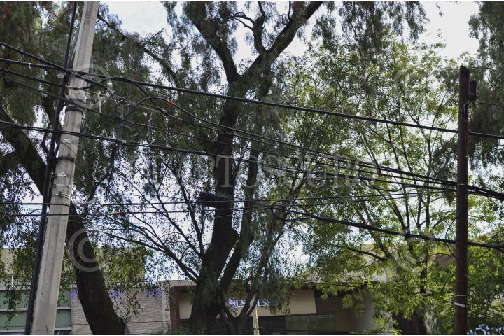 MÉXICO, D.F., 09AGOSTO2015.- Tras dos años de haber sido sometida a un proceso de remodelación, la Avenida Mazaryk, una de las principales arterias viales y peatonales de Polanco, además de una de las zonas comerciales más significativas de la capital, hoy luce, de acuerdo con vecinos que protestaron esta mañana como "un robo". Los supuestos objetivos como cableado subterráneo, aprovechamiento del espacio público en carriles centrales, reforestación de pabellones, y limpieza en general, "no fueron cumplidos", según argumentan. En la imagen, cables de luz se interponen entre los árboles, lo que significa que el cableado subterráneo prometido a los vecinos de la zona, aun no se ha puesto en servicio. FOTO: MARÍA JOSÉ MARTÍNEZ /CUARTOSCURO.COM