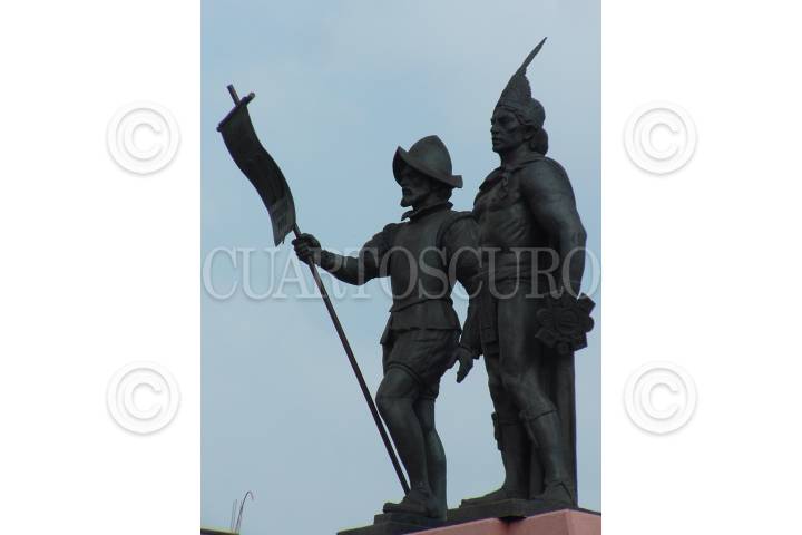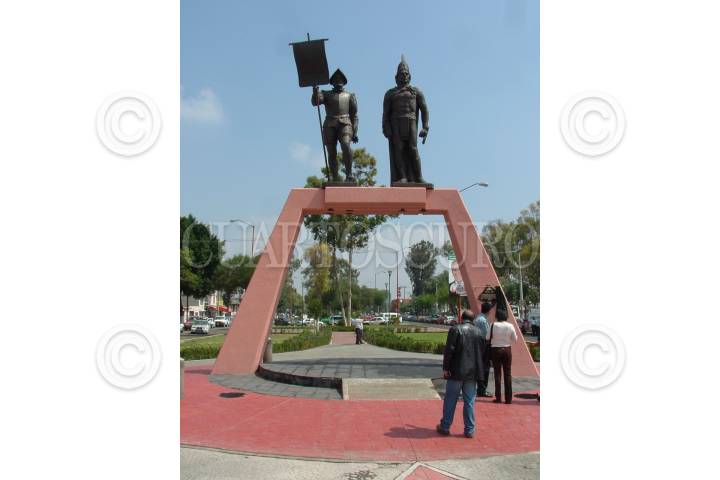 ECATEPEC, ESTADO DE MÉXICO., 12OCTUBRE2008.- Obra “Dos de… uno”, esculturas de un azteca y un español, elaborada en 2005 con motivo de la celebración del “Encuentro de Dos Mundos”, en la colonia Ciudad Azteca 1ª,su autor Víctor Gutérrez, escultor, explicó que las esculturas denotan el encuentro de dos mundos que en un día como hoy 12 de Octubre, la interpretación de su obra, es una escultura arquitectónica mesoamericana, donde un “azteca” porta en su mano una mazorca de maíz. FOTO: MARIO NULO/CUARTOSCURO.COM