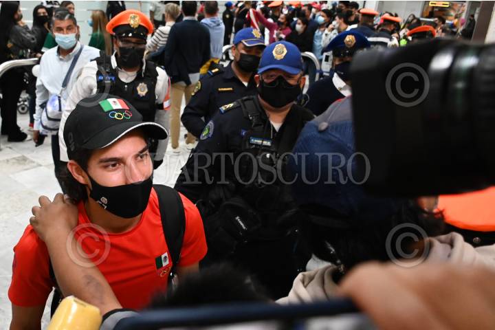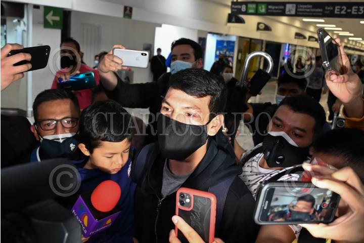 Alexis Vega, delantero mexicano, sale escoltado por elementos de seguridad del aeropuerto.