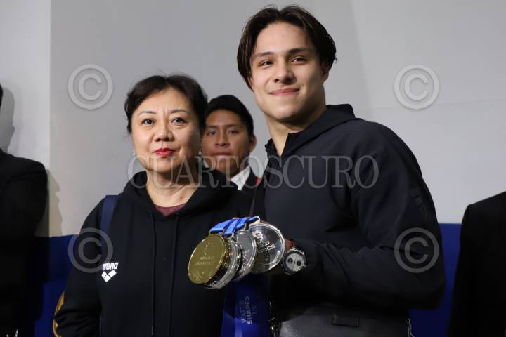 CIUDAD DE MÉXICO, 05AGOSTO2025.- El clavadista mexicano, Osmar Olvera, se toma una fotografía con su entrenadora, Ma Jin y muestra las medallas que ganó durante el Campeonato Mundial de Deportes Acuáticos, el atleta resaltó el aporte de la preparadora china y solicitará a la presidenta de México, Claudia Sheinbaum, un aumento a su salario para que continúe preparando a los equipos mexicanos para las siguientes competiciones. FOTO: DANIEL AUGUSTO/ CUARTOSCURO.COM