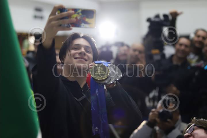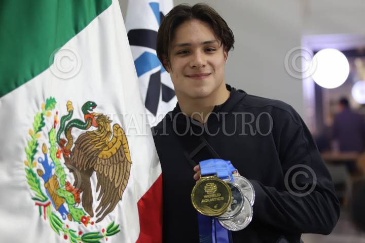 CIUDAD DE MÉXICO, 05AGOSTO2025.- El clavadista mexicano, Osmar Olvera, llegó esta madrugada a la capital del país luego de su participación en el Campeonato Mundial de Deportes Acuáticos, donde logró llevarse cuatro medallas, tres de plata y una de oro, con la cual superó a los clavadistas chinos, lo que no sucedía desde hace más de 20 años. FOTO: DANIEL AUGUSTO/ CUARTOSCURO.COM