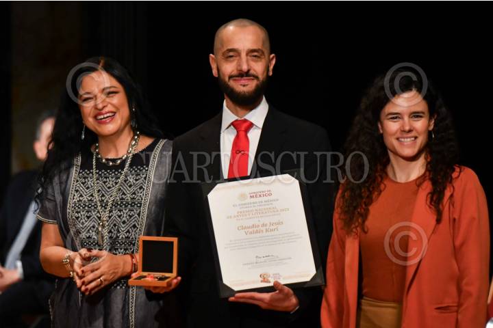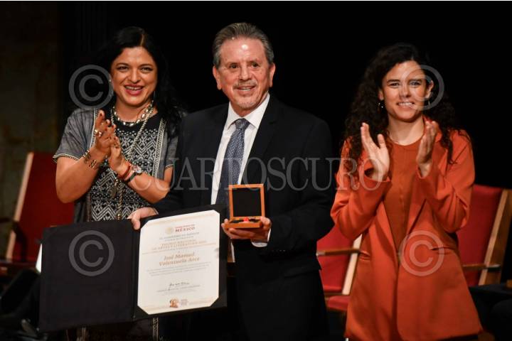 CIUDAD DE MÉXICO, 27FEBRERO2024.- Jose Manuel Valenzuela Arce, recibió el Premio Nacional de Artes y Literatura 2023 en el campo de Historia, Ciencias Sociales y Filosofía, durante ceremonia realizada en el Palacio de Bellas Artes, con la presencia de Alejandra Frausto, secretaria de Cultura, y María Luisa Alcalde, secretaria de Gobernación. FOTO: MARIO JASSO/CUARTOSCURO.COM