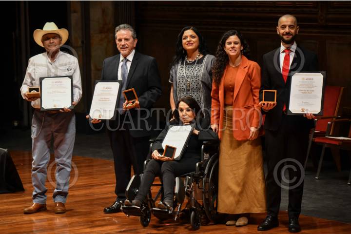 CIUDAD DE MÉXICO, 27FEBRERO2024.- Los galardonados al Premio Nacional de Artes y Literatura 2023: Guillermo Velázquez Benavides (Artes y Tradiciones Populares); Jose Manuel Valenzuela Arce (Historia, Ciencias Sociales y Filosofía); Beatriz Espejo (Lingüística y Literatura) y Claudio de Jesús Valdés Kuri (Bellas Artes), junto a Alejandra Frausto, secretaria de Cultura, y María Luisa Alcalde, secretaria de Gobernación, durante ceremonia realizada en el Palacio de Bellas Artes. FOTO: MARIO JASSO/CUARTOSCURO.COM