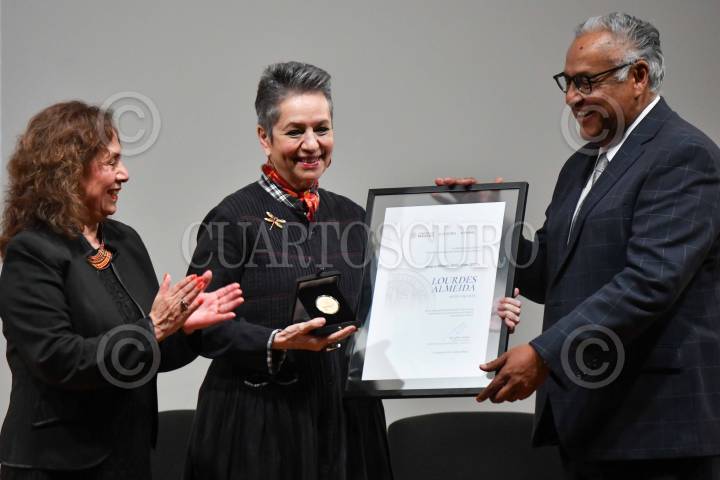 CIUDAD DE MÉXICO, 06AGOSTO2024.- Lourdes Almeida, fotógrafa, durante la recibió la medalla "Bellas Artes 2023" en la disciplina de Artes Visuales, ceremonia realizada en la Sala Manuel M. Ponce del Palacio de Bellas Artes. La acompañan: Lucina Jiménez, directora general del INBAL, y Juan Carlos Valdez. FOTO: MARIO JASSO/CUARTOSCURO.COM