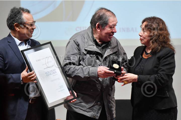 CIUDAD DE MÉXICO, 06AGOSTO2024.- Guillermo Ceniceros, pintor, durante la recibió la medalla "Bellas Artes 2023 " en la disciplina de Artes Visuales, ceremonia realizada en la Sala Manuel M. Ponce del Palacio de Bellas Artes. Lo acompaña: Lucina Jiménez, directora general del INBAL. FOTO: MARIO JASSO/CUARTOSCURO.COM