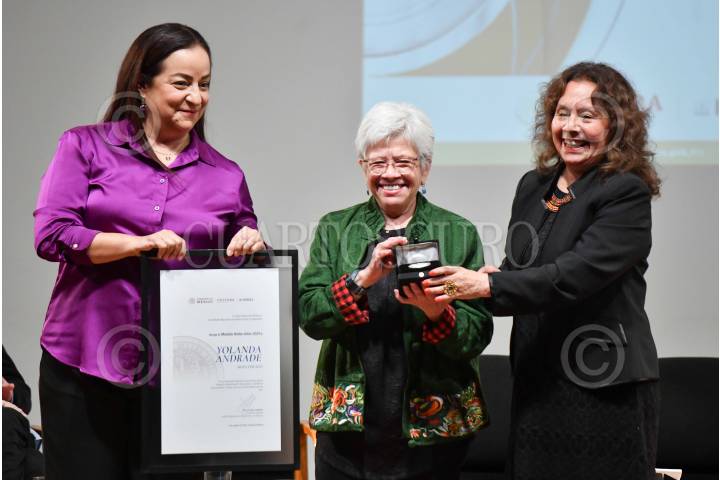 CIUDAD DE MÉXICO, 06AGOSTO2024.- Yolanda Andrade, fotógrafa, recibió la medalla "Bellas Artes 2024 " en la disciplina de Artes Visuales, ceremonia realizada en la Sala Manuel M. Ponce del Palacio de Bellas Artes. La acompañan: Adriana Castillo, y Lucina Jiménez, directora general del INBAL. FOTO: MARIO JASSO/CUARTOSCURO.COM