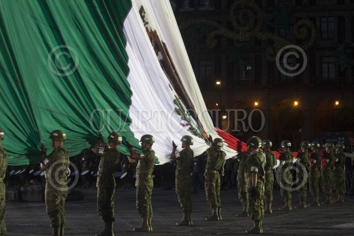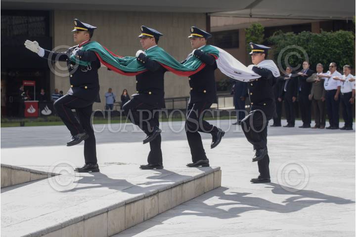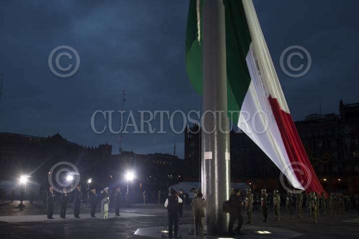 CIUDAD DE MÉXICO, 19SEPTIEMBRE2024.- Ceremonia de izamiento de bandera a media asta en memoria de las víctimas de los sismos de 1985 y 2017, realizada en el zócalo capitalino. FOTO: MARIO JASSO/CUARTOSCURO.COM