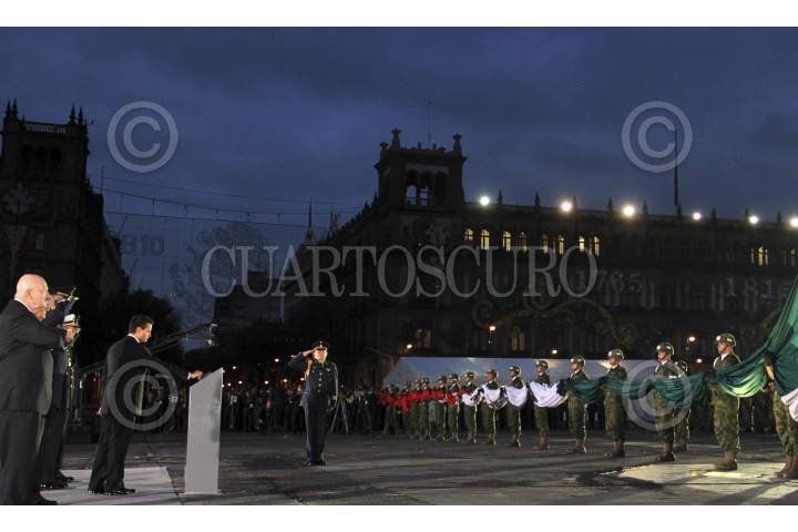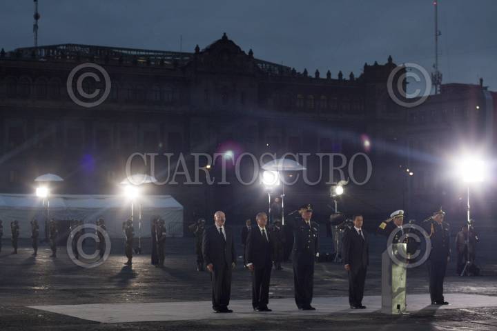 MÉXICO, D.F., 19SEPTIEMBRE2013.- En punto de la 07:19; Manuel Mondragón, comisionado nacional de Seguridad, Luis Felipe Puente Espinosa, Coordinador General de Protección Civil de la Secretaria de Gobernación, Salvador Cienfuegos, secretario de la Defensa Nacional, Enrique Peña Nieto, Presidente de la República, Vidal Francisco Soberón Sanz, secretario de Marina y Roberto Miranda, Jefe del Estado Mayor Presidencial, encabezaron la ceremonia de aniversario de los sismos de 1985, en la plancha del Zócalo en donde se hizo la bandera a media asta en señal de luto por las víctimas de la tragedia ocurrida hace 28 años. FOTO: MOISÉS PABLO /CUARTOSCURO.COM