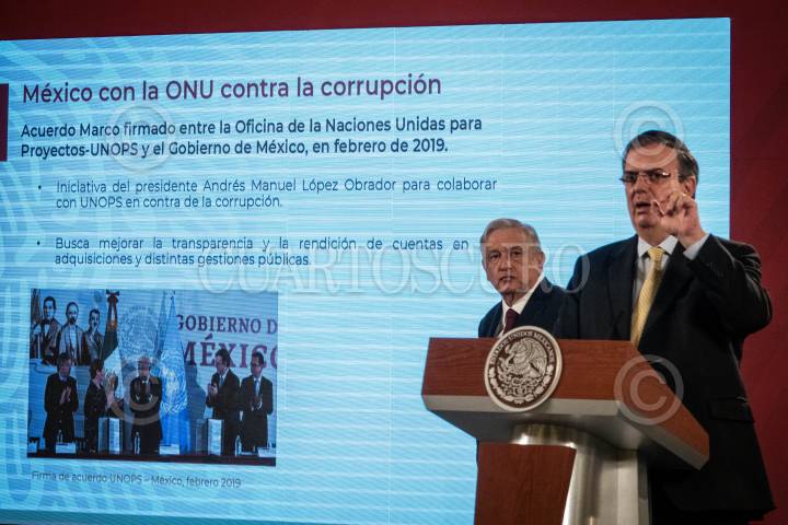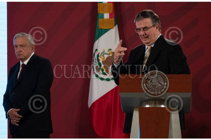 Andrés Manuel López Obrador, presidente de México, acompañado de Marcelo Ebrard, secretario de Relaciones Exteriores, durante la conferencia matutina en Palacio Nacional