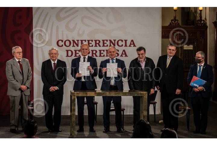 Andrés Manuel López Obrador, presidente de México, acompañado de Jorge Alcocer Varela, secretario de Salud; Cristian Morales fuhrimann, representante de OPS/OMS en México; Fernando Cotrim Barbieri, representante de UNOPS; Juan Antonio Ferrer Aguilar,