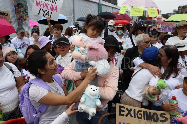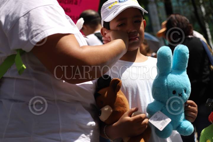 CIUDAD DE MÉXICO, 10AGOSTO2025.- Un infante es consolado por una persona durante la marcha Queremos Medicinas, donde exigen el abasto de medicamentos en todos los estados para poder continuar sus tratamientos. FOTO: DANIEL AUGUSTO/ CUARTOSCURO.COM