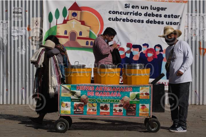 Vendedor de nieves en la Plaza de la Paz esperando clientes durante la segunda semana de semáforo amarillo en el estado.