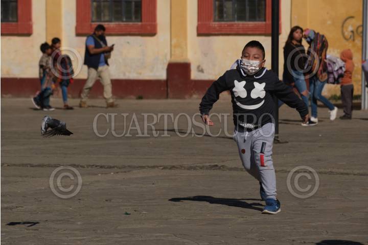 Un niño juega con las palomas en la plaza de la Paz durante la segunda semana de semáforo amarillo en el estado por Covid 19.