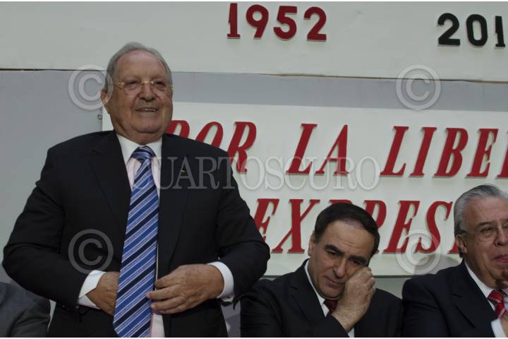 MÉXICO, D.F., 12MARZO2015.- Olegario Vázquez Raña, director de Excélsior; acompañado de Mauris Salloum George, presidente del Cllub de Periodistas. Un total de 6 mil 639 trabajos periodísticos contendieron en esta edición por el Premio Nacional de Periodismo del Club de Periodistas, que hoy se entregó en las instalaciones del Club. Entre los premiados se encuentra la Agencia Cuartoscuro y su director Pedro Valtierra; además de Javier Solórzano, Yuriria Sierra, el periodista Virgilio Caballero, y José Luis Calva, Investigador del Instituto deInvestigaciones Económicas de la UNAM. La premiación fue encabezada por Mauris Salloum George, presidente del Club. FOTO: MARÍA JOSÉ MARTÍNEZ /CUARTOSCURO.COM