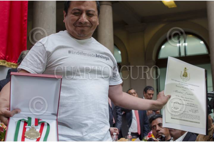 MÉXICO, D.F., 12MARZO2015.- El periodista Mardonio Carballo, colega de la periodista Carmen Aristegui de MVS Noticias, recibió el Premio Nacional de Periodismo por su trabajo de periodismo cultural. Portaba una playera que contenía la leyenda #EnDefensadeAristegui, como una forma de expresar su apoyo a la periodista por la controversia que se ha desprendido del caso Méxicoleaks y Noticias MVS. FOTO: MARÍA JOSÉ MARTÍNEZ /CUARTOSCURO.COM