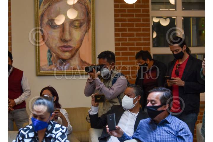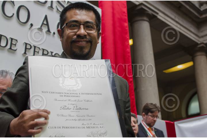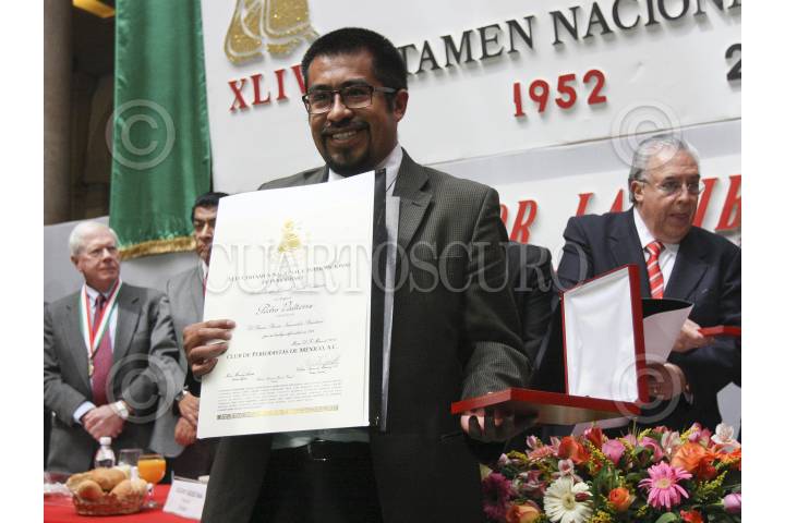 MÉXICO, D.F., 12MARZO2015.- Moisés Pablo, editor de la Agencia Cuartoscuro, recibió en representación de Pedro Valtierra, director de Cuartoscuro, el Premio Nacional de Periodismo, por el trabajo realizado durante 2014 y trayectoria fotográfica, que otorga el Club de Periodistas de México. Un total de 6 mil 639 trabajos periodísticos contendieron en esta edición por el premio, provenientes de medios nacionales e internacionales. Entre los premiados se encuentra la Agencia Cuartoscuro y su director Pedro Valtierra; además de Javier Solórzano, Yuriria Sierra, el periodista Virgilio Caballero, y José Luis Calva, Investigador del Instituto deInvestigaciones Económicas de la UNAM. FOTO: MARÍA JOSÉ MARTÍNEZ /CUARTOSCURO.COM