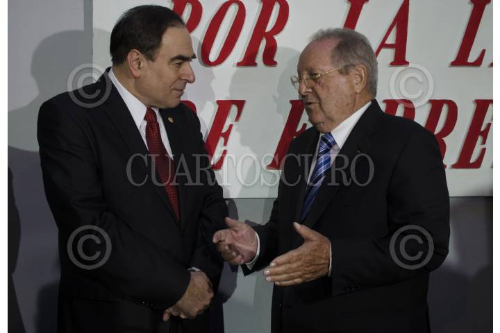 MÉXICO, D.F., 12MARZO2015.- Mauris Salloum George, presidente del Club de Periodistas, y Olegario Vázquez Raña, director del periódico Excélsior y presidente del Grupo Empresarial Ángeles, previo a la entrega del Premio Nacional de Periodismo organizado por el Club de Periodistas. FOTO: MARÍA JOSÉ MARTÍNEZ /CUARTOSCURO.COM