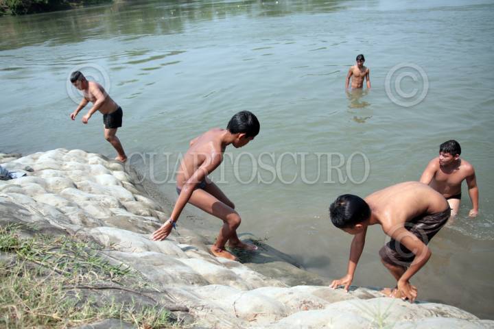 VILLAHERMOSA, TABASCO, 09MAYO2009.- Ante los incesantes más de 40 grados centígrados a la sombra en esta tarde, algunos niños y adolescentes se refrescan en zambullidas sin medir el peligro en las traicioneras aguas del río Carrizal. FOTO: MARCO POLO GUZMÁN HERNÁNDEZ/CUARTOSCURO.COM