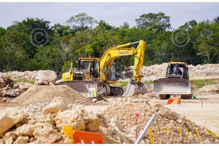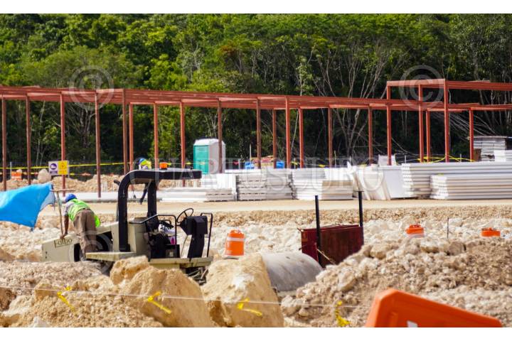 Aspectos de los trabajos e instalación de estructuras de lo que será una de las estaciones del Tren Maya en el tramo que se ubica atrás del aeropuerto de Cancún, Quintana Roo.