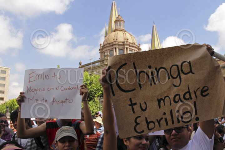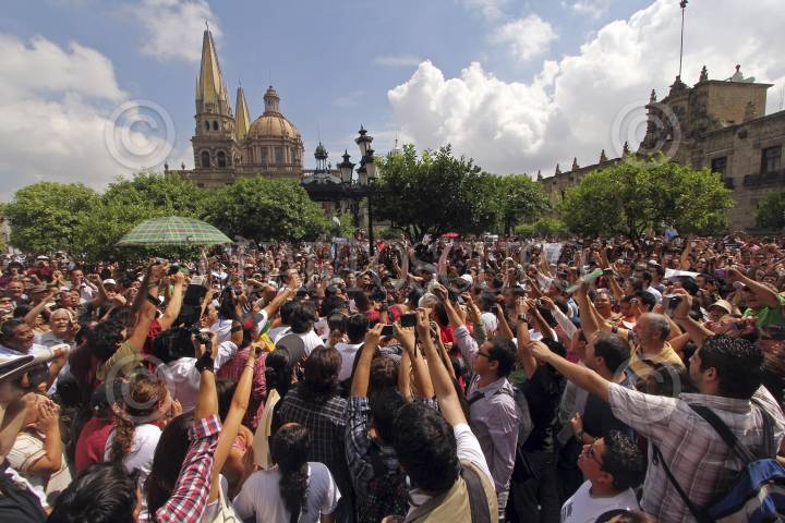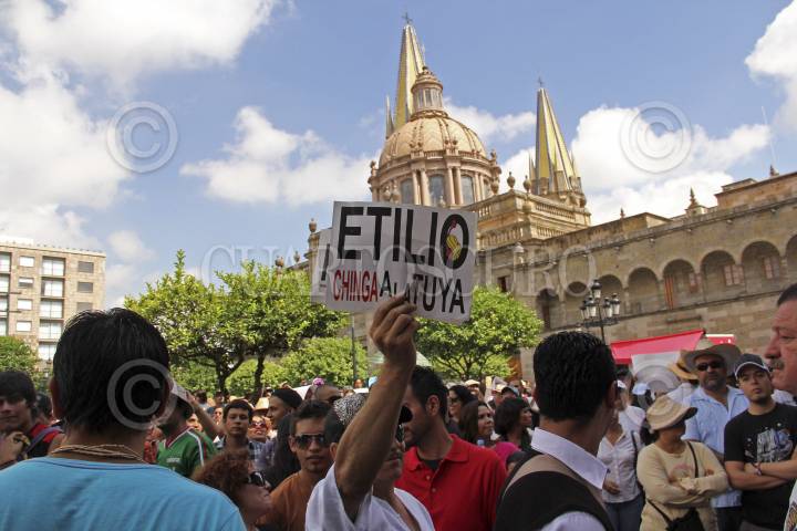 GUADALAJARA, JALISCO, 23JUNIO2012.- Se llevo a cabo una marcha por las principales calles de la ciudad para gritar la mega mentada de madre con destino al gobernador Emilio González Márquez, la movilización culmino en la Plaza de Armas. Esta demostración en contra del mandatario rompió el Récord Guinnes y fue organizado por la ciudadanía con la finalidad de regresarle la cortesía al mandatario, quien le mento la madre a la sociedad en abril de 2008. FOTO: FERNANDO CARRANZA GARCÍA /CUARTOSCURO.COM