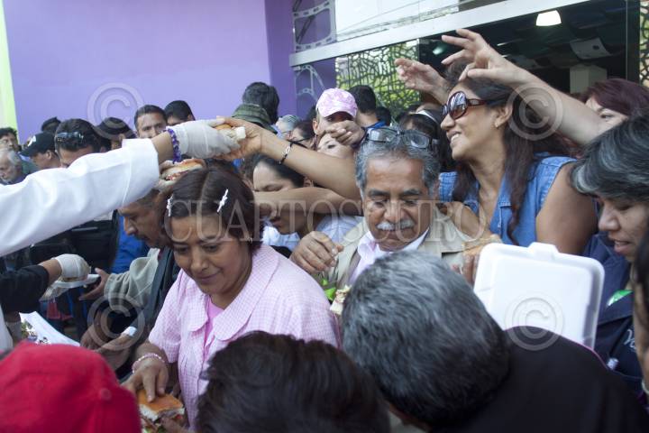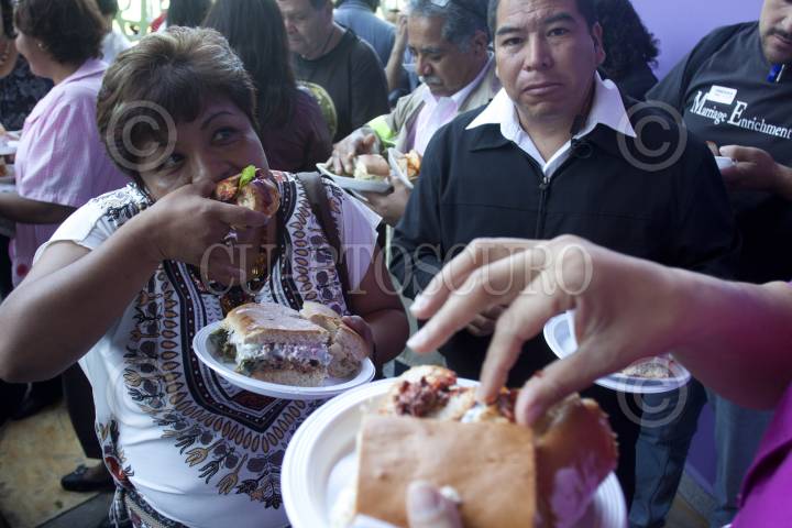 MÉXICO, D.F., 24JULIO2012.- Personas disfrutan de una pedazo de la megatorta de 7 metros que se realizó en el marco del anunció de la 9a Feria de la Torta a inaugurarse el 1 de agosto en la explanada de la delegación Venustiano Carranza. FOTO: MOISÉS PABLO /CUARTOSCURO.COM
