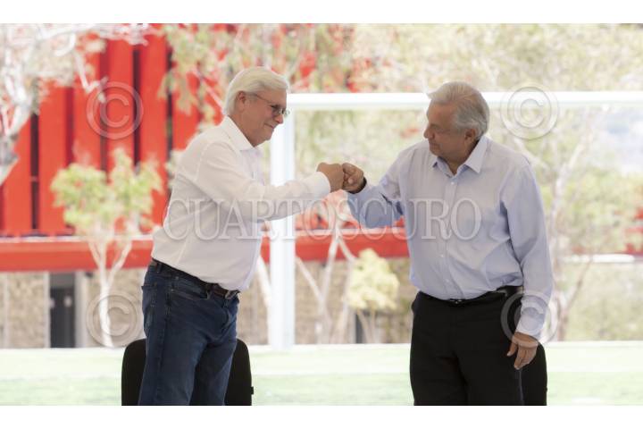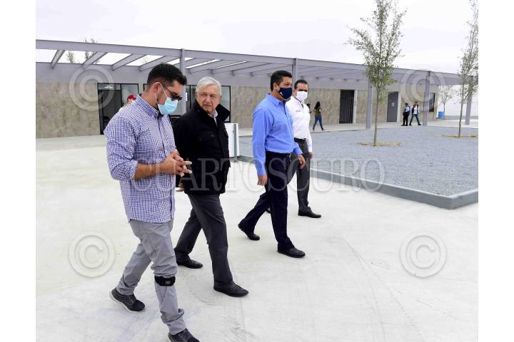 Andrés Manuel López Obrador, Presidente de México, y Román Meyer, Secretario de Desarrollo Agrario; territorial y Urbano; durante el evento "Acciones de Mejoramiento Urbano en Nuevo Laredo".