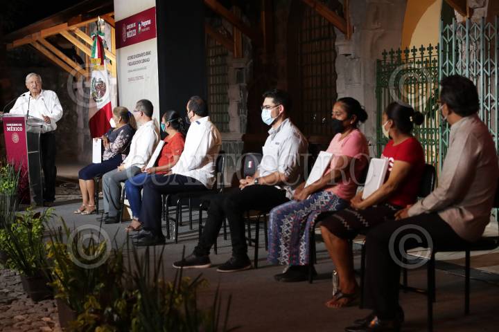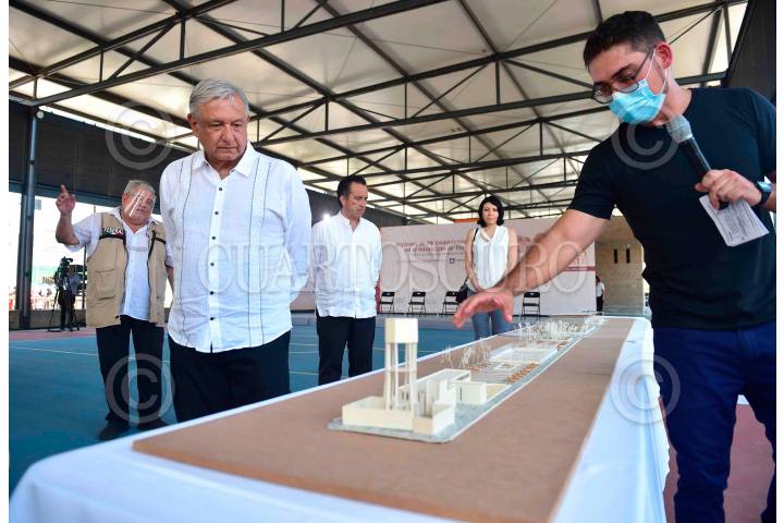 Andrés Manuel López Obrador, Presidente de México, recibe una explicación por parte de Román Meyer, titular de la SEDAT, durante el evento "Acciones de Mejoramiento Urbano", en Veracruz.