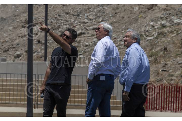 Román Meyer, Secretario de Desarrollo Agrario; territorial y Urbano; Andrés Manuel López Obrador, Presidente de México; Javier García Cabeza de Vaca, Gobernador de Tamaulipas, y Óscar Enrique Rivas, Presidente municipal de Nuevo Laredo, durante el e