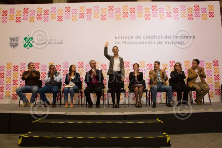 CIUDAD DE MÉXICO, 28FEBRERO2019.- Ernesto Villalobos Ayala, Ricardo Molina Teodoro, Pedro Sosa Álvarez, Claudia Sheinbaum Prado, Ileana Villalobos Estrada, Anselmo Peña Collazo, Rodrigo Chávez Contreras, encabezaron la entrega de Créditos del Programa de Mejoramiento de Vivienda, en el patio oriente del Antiguo Palacio de Ayuntamiento. Vecinos de cada una de las alcaldías acudieron para representar de manera simbólica el arranque de los apoyos que se entregarán en todas las demarcaciones. FOTO: ROGELIO MORALES /CUARTOSCURO.COM