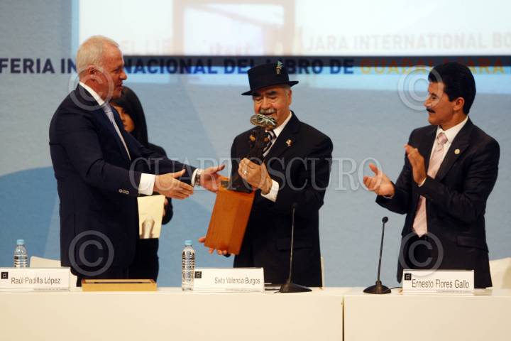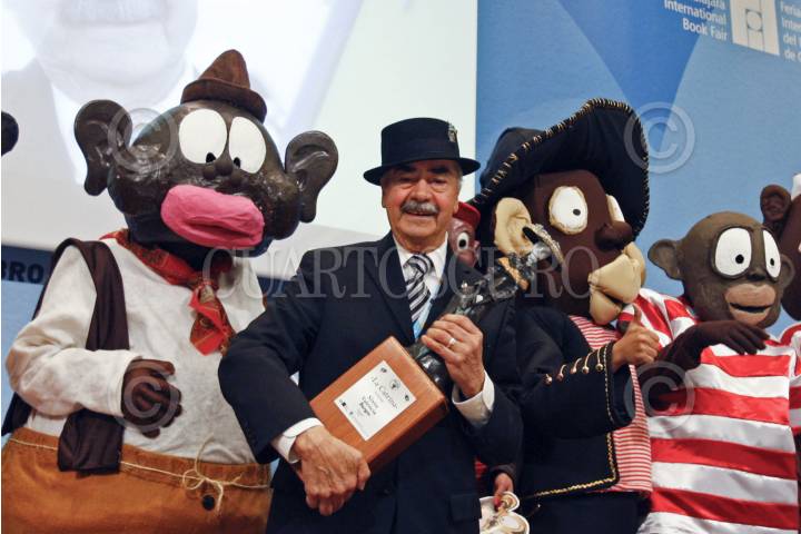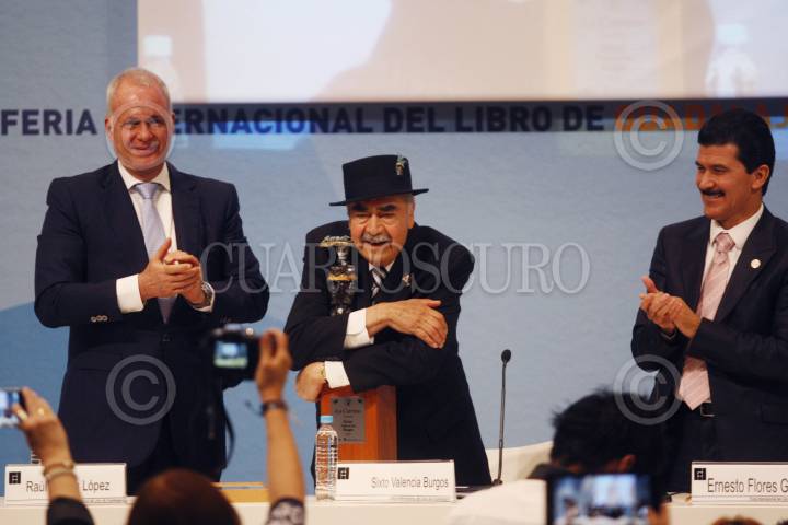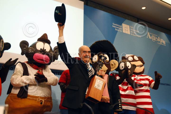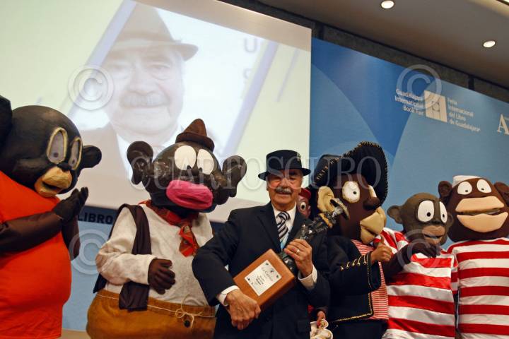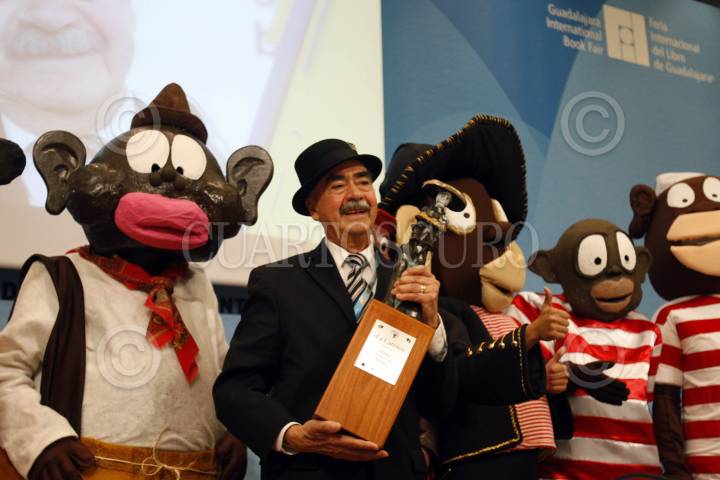 GUADALAJARA, JALISCO, 06DICIEMBRE2014.- Hoy en la Expo y en el marco de la edición 28 de la Feria Internacional del Libro de Guadalajara 2014 (FIL), se llevo a cabo el Homenaje de Caricatura la Catrina y se Reconocio al Historietista Mexicano creador de Memín Pinguín, Sixto Valencia Burgos FOTO: FERNANDO CARRANZA GARCIA / CUARTOSCURO.COM