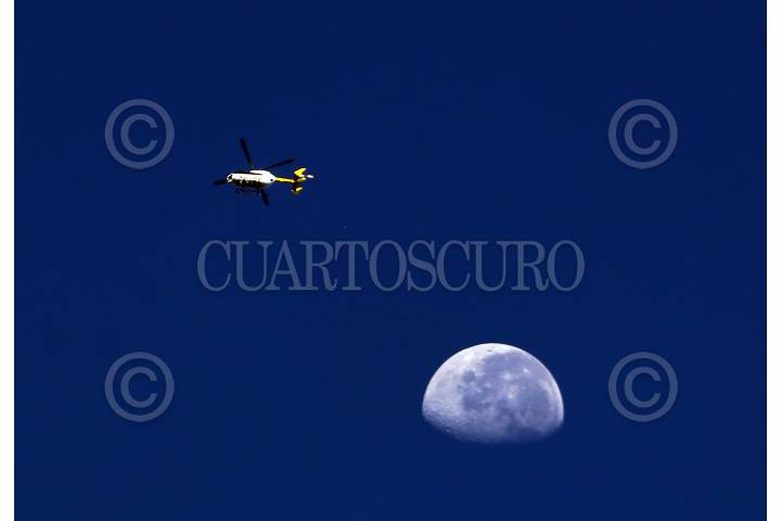 La luna en su fase menguante sirve de escenario para el paso de un helicóptero en Cuernavaca.