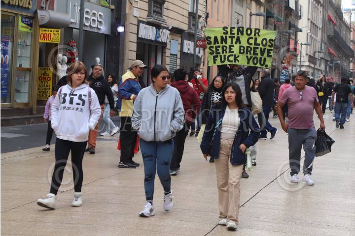 CIUDAD DE MÉXICO, 24DICIEMBRE2024. Un hombre camina con un mensaje para Santa Claus en la calle de Madero en vísperas de navidad. FOTO: EDGAR NEGRETE LIRA/CUARTOSCURO.COM