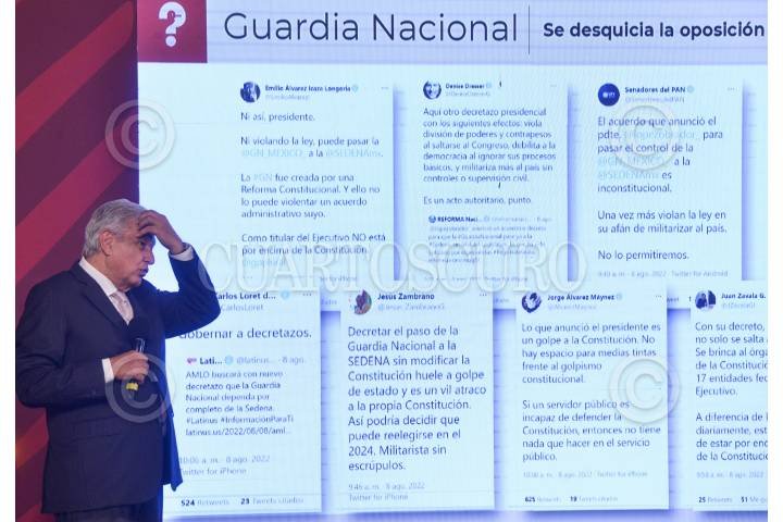 Andrés Manuel López Obrador oserva un video del medio Infodemia que muestra los avances en el juicio del ex secretario de Seguridad Gerardo García Luna, durante la conferencia matutina en Palacio Nacional.