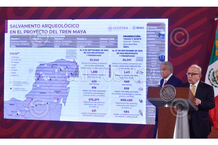 Diego Prieto, director general del INAH, realizó la exposición del salvamento arqueológico en el proyecto del tren maya, durante la conferencia matutina realizada en Palacio Nacional.