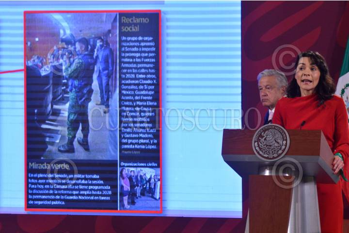 Ana Elizabeth García Vilchis, directora de Redes de la Coordinación General de Comunicación Social y Vocería de Presidencia, durante su sección "Quién es quién en las mentiras de la semana" en la conferencia matutina realizada en Palacio Nacional.