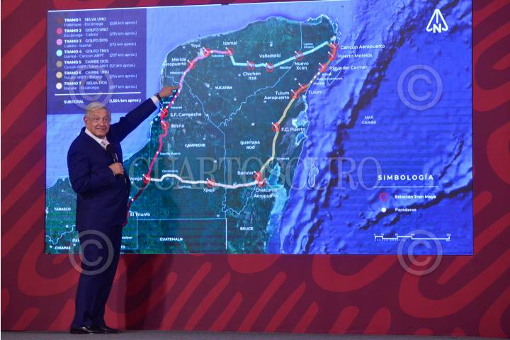 Andrés Manuel López Obrador, presidente de México, explica la ruta y estaciones del tren maya durante conferencia matutina realizada en Palacio Nacional.