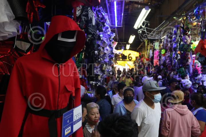 Con el regreso al Semáforo verde epidemiológico en la Ciudad, decenas de familias capitalinas aprovechan la cercania del día de muertos para comprar disfraces en el mercado Sonora. Según comerciantes el más vendido ha sido el del Juego de Calamar, serie recién estrenada en plataforma de series y peliculas.