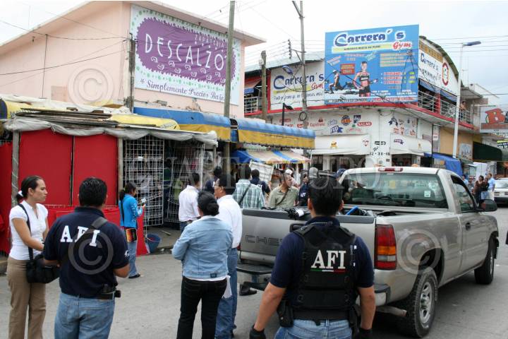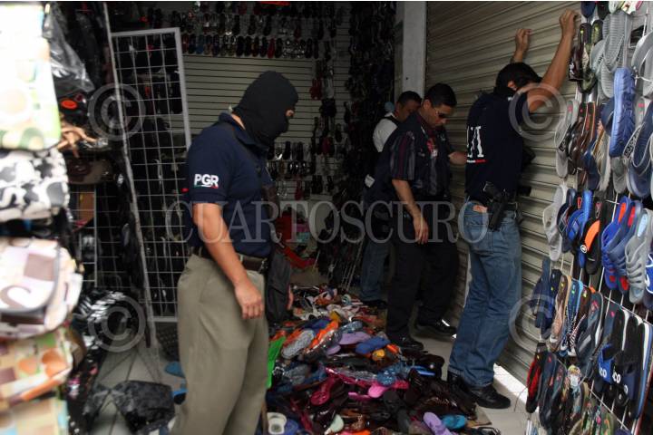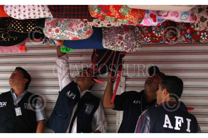 VILLAHERMOSA, TABASCO, 03MARZO2010.- Elementos de la Agencia Federal de Investigaciones (AFI) realizaron un operativo en distintos puestos establecidos sobre los alrededores del mercado público José María Pino Suárez. Los agentes logran asegurar varios cientos de bolsas de dama, mochilas escolares, calzado, entre otros accesorios; todos de dudosa calidad que fueron introducidos como contrabando. FOTO: MARCO POLO GUZMÁN HERNÁNDEZ/CUARTOSCURO.COM