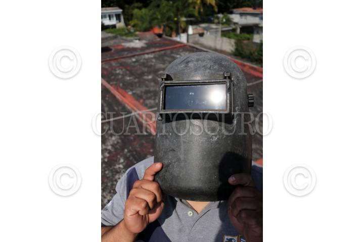 YAUTEPEC, MORELOS, 11NOVIEMBRE2019.- Tránsito del planeta Mercurio por delante del Sol. Con una duración de 5 horas y 29 minutos el fenómeno pudo ser visto en su totalidad en todo el país, siendo el más largo del siglo. En la imagen un joven mira a través de una careta de soldador el fenómeno en la colonia La Joya. FOTO: MARGARITO PÉREZ RETANA /CUARTOSCURO.COM