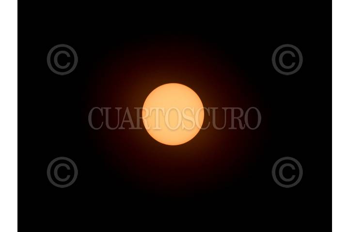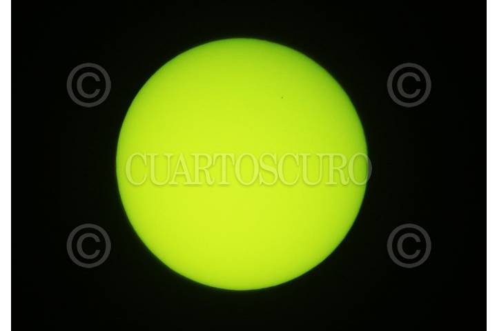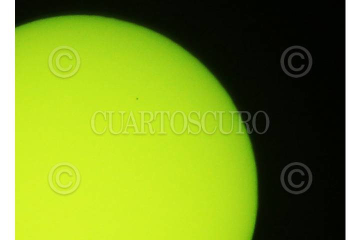 YAUTEPEC, MORELOS, 11NOVIEMBRE2019.- Tránsito del planeta Mercurio por delante del Sol. Con una duración de 5 horas y 29 minutos el fenómeno pudo ser visto en su totalidad en todo el país, siendo el más largo del siglo. En la imagen se observa en la porción superior derecha un lunar negro que es el planeta Mercurio, visto a través de un filtro para soldar con 12 de graduación. FOTO: MARGARITO PÉREZ RETANA /CUARTOSCURO.COM