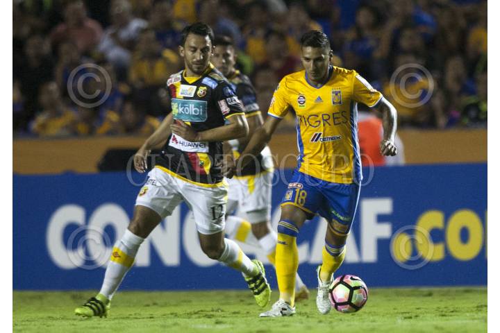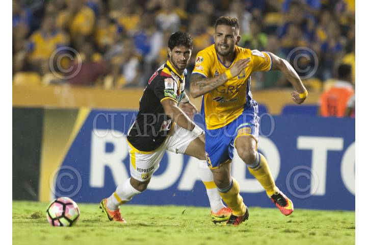 MONTERREY, NUEVO LEÓN, 18OCTUBRE2016.- Ismael Sosa del equipo de los Tigres de la UANL se disputa el balón con Randall Azofeifa del equipo del Heridiano, en el Estadio Universitario, partido correspondiente en fase de grupos de CONCACAF Liga de Campeones 2016. Marcador Final: Tigres: 2 - Heridiano: 0 FOTO: GABRIELA PÉREZ MONTIEL /CUARTOSCURO.COM